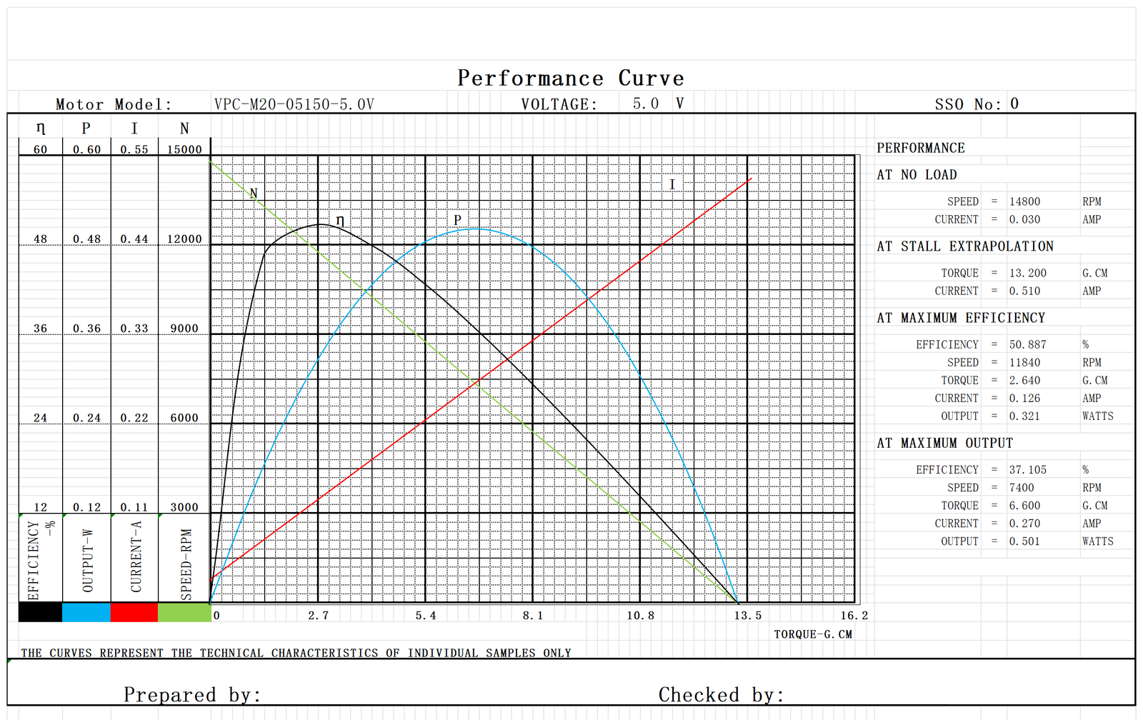 | Model No. | Nominal Voltage | No load | Max Efficiency | Stall | |||||